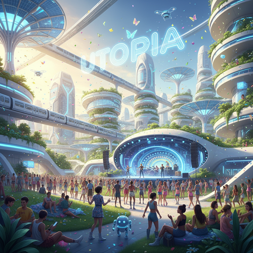 A vision of a positive, bright, and imagined futuristic world, celebrating human potential, harmony, and technological advancement.