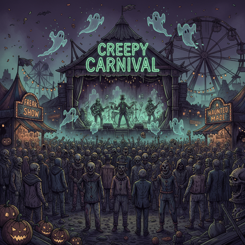 A spine-tingling carnival atmosphere where thrilling rides meet chilling horror, spectral, haunting fun.